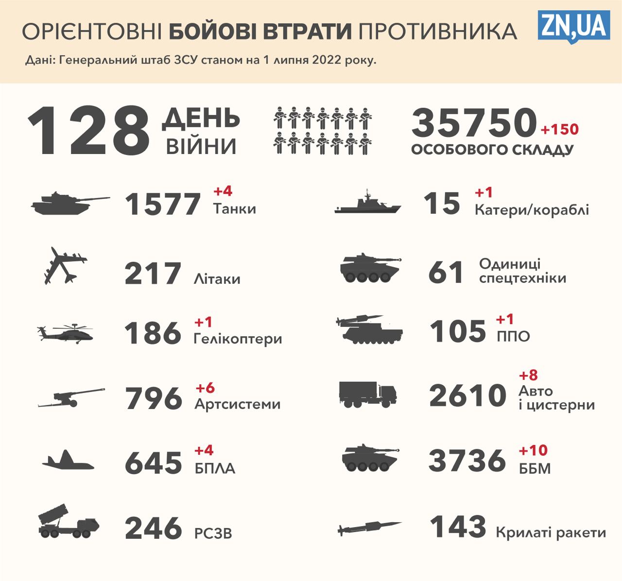 Загальні бойові втрати противника з 24.02 по 01.07 орієнтовно склали: