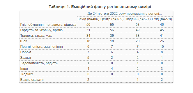 Головні емоції, які у українців викликає війна Росії проти України – це гнів, обурення, ненависть та відраза: їх відчувають 53%співгромадян. Водночас також гордість за Україну, її армію відчувають 52%. Тривога, страх та жах є наскрізною емоцією для 38% українців, йдеться в свіжому опитуванні Київського міжнародного інституту соціології.