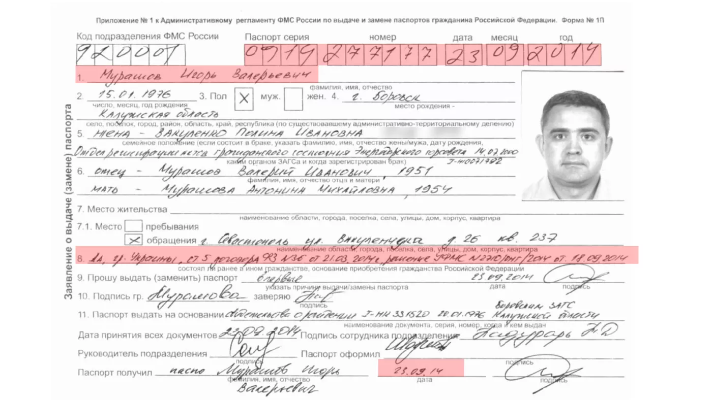 Паспорт Мурашову видали на підставі заяви на отримання громадянства РФ відповідно до статті так званого «договору» «між Російською Федерацією та Республікою Крим», згідно з якою РФ визнавала громадян України та осіб без громадянства, які на момент анексії постійно проживали на півострові, своїми громадянами.