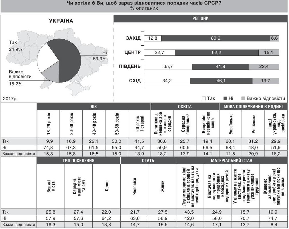 Прихильників відновлення порядків радянських часів значно більше на Сході і Півдні (34-36%), серед громадян віком 50-59 (30%) і особливо старших за 60 років (42%), серед громадян з нижчим рівнем освіти (31%), російсько- і двомовних (30-31%), найменш заможних (44%).