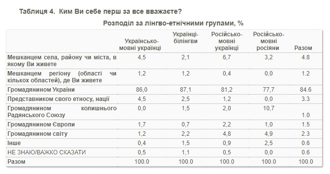 Також серед жителів сходу 81% вважають себе перш за все громадянами України, серед російськомовних українців – 81%, серед російськомовних росіян – 78%.