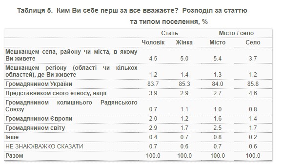 Мешканцем свого населеного пункту або регіону себе вважають трохи більше 6%. Громадянином світу або Європи себе назвали майже 4%. Близько 3% вважають себе представником етносу або нації. Громадянином колишнього Радянського Союзу себе відчуває трохи менше 1% опитаних. Отже, за невеликими винятками, населення України вважає себе перш за все громадянами своєї країни.