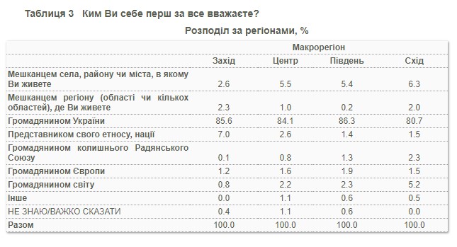 Що є стосується регіональних відмінностей, то на сході країни показник громадянської ідентичності зменшується до 80,7%, натомість стає більше людей, які ідентифікують себе мешканцем свого населеного пункту або регіону.