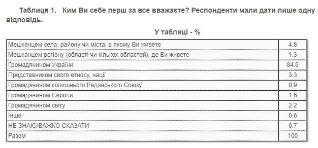 На питання «Ким Ви себе перш за все вважаєте?», що стосувалося ідентичності в територіальному та політичному контекстах, майже 85% опитаних обрали варіант відповіді «Громадянином України».