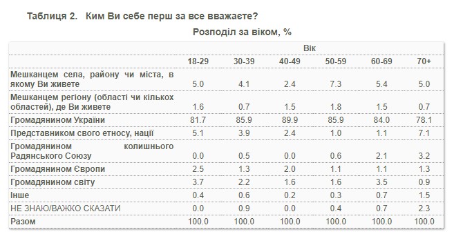 Схожа картина зберігається в різних соціально демографічних групах. Найбільше відхиляються від середнього показника респонденти у віці від 18 до 29 років (81,7%), а також респонденти у віці від 70 років і старше (78,1%). В наймолодшій групі при цьому більше людей, які ідентифікують себе за етносом чи містом проживання.