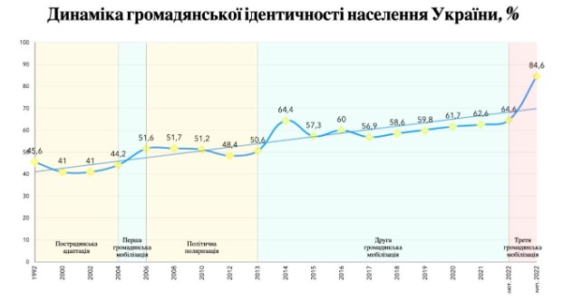 Ґрунтуючись на даних Інституту соціології НАН України соціологи вказують, що з 1992 року громадянська ідентичність українців зросла майже у два рази – з 45,6% до 84,6%, зробивши тим самим маргінальними усі інші види ідентичності в територіальному та політичному контексті.