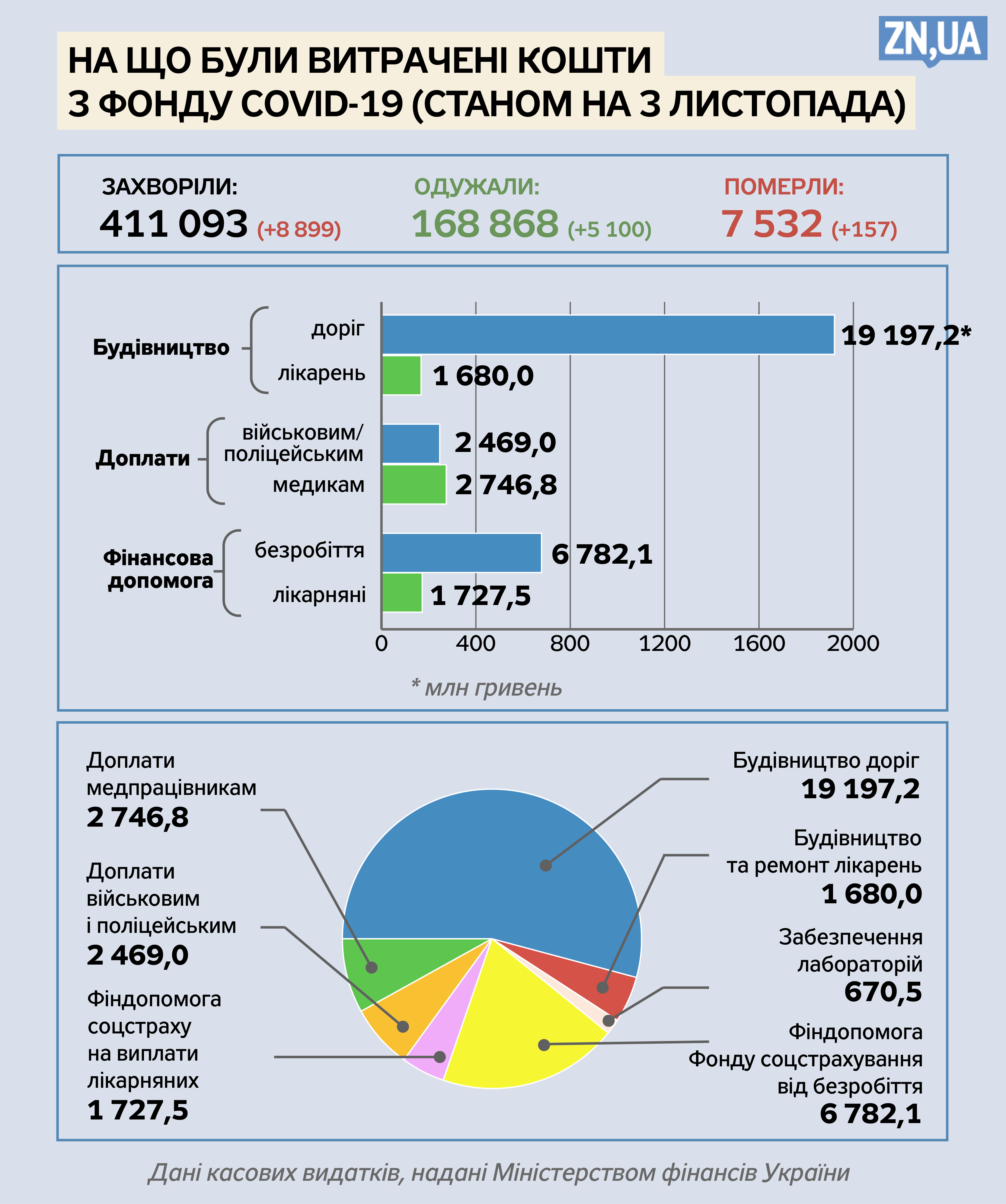 Станом на ранок вівторка, 3 листопада, в Україні 411 093 випадки зараження коронавірусом. Протягом понеділка в Україні виявили 8 899 випадків COVID-19, зафіксовано 157 летальних випадків 5 100 пацієнтів одужали.