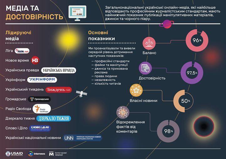 Медіа отримувало бал за кожну з категорій. До переліку увійшли ЗМІ, що набрали щонайменше дев'ять балів: Дзеркало Тижня, Liga.net, "Українська правда", "Укрінформ", "Новое время", "Радіо Свобода", "Український тиждень", "Слово і діло", "Українські національні новини", "Громадське телебачення".