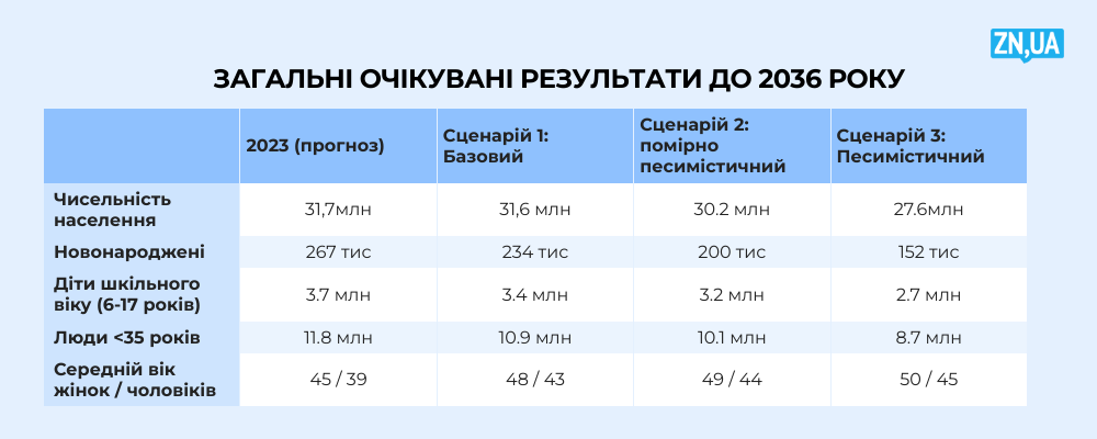 Розглядаються три можливі сценарії зміни чисельності населення до 2036 року: базовий, помірно-песимістичний та песимістичний. Так, за базовим сценарієм до 2036 року чисельність населення України складе 31,6 мільйона людей (за оцінками, у 2023 році вона склала 31,7 мільйона). За помірно-песимістичним, чисельність населення нашої країни скоротиться до 30,2 мільйона, а за песимістичним – до 27,6 мільйона.