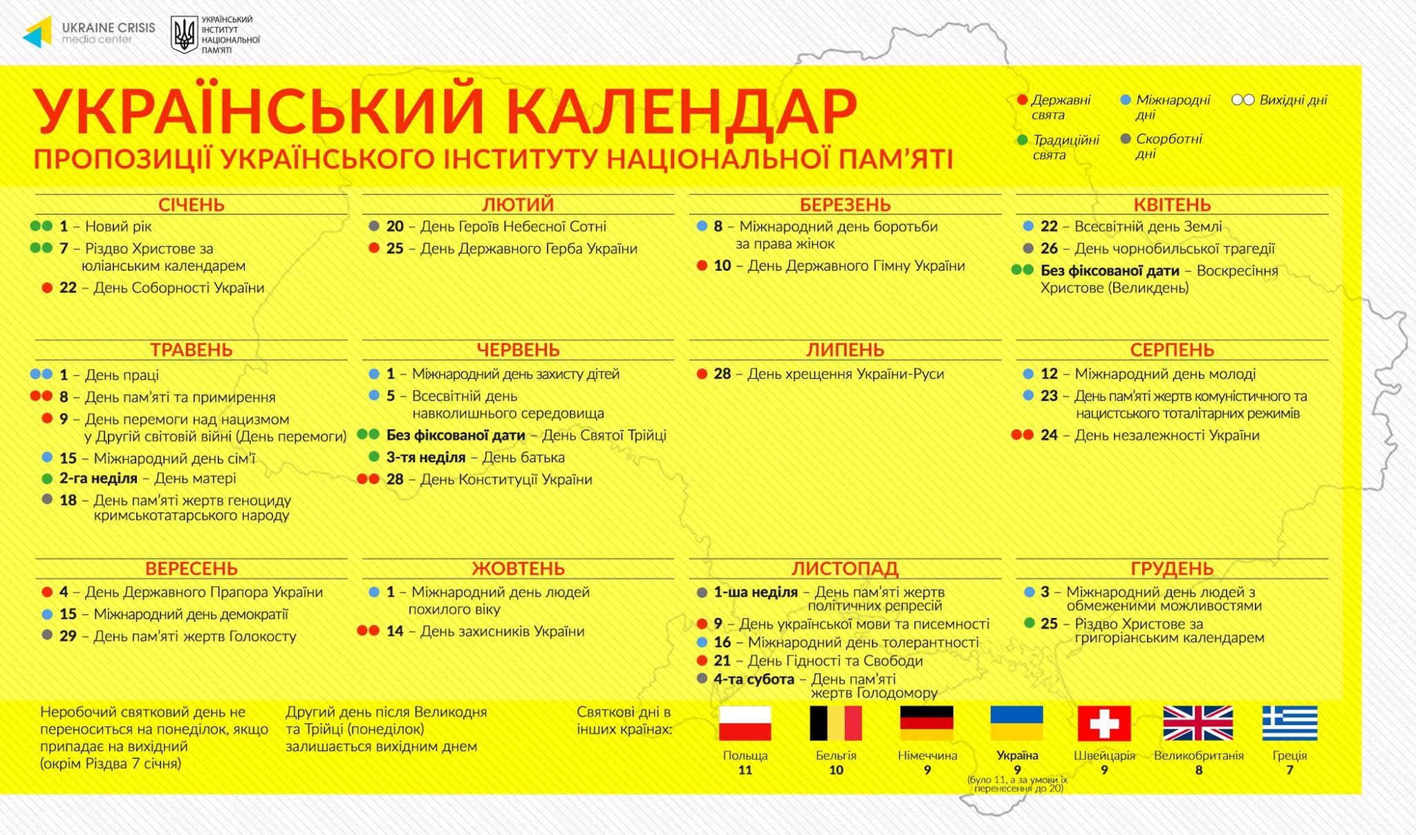 Український інститут національної пам'яті за результатами громадського обговорення підготував новий проект закону "Про державні та інші свята, пам'ятні дати і скорботні дні".