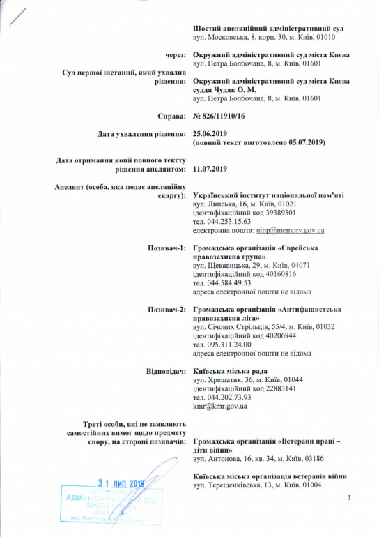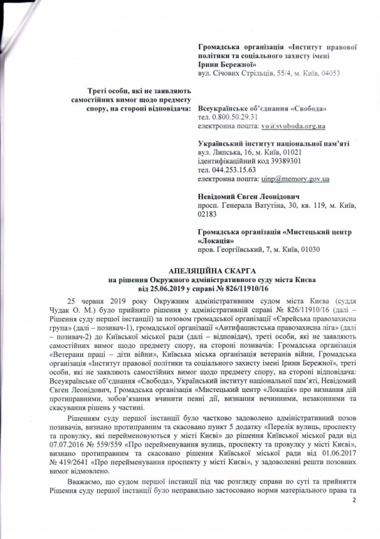 На рішення Окружного адмінсуду Києва щодо скасування перейменування проспектів Московського та Генерала Ватутіна на Степана Бандери і Романа Шухевича подано скаргу. Про це повідомляє у четвер пресцентр Українського інституту національної пам'яті (УІНП).