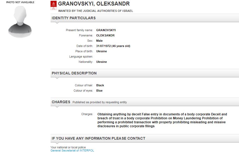 Згідно з повідомленням, громадянин України Олександр Грановський 1972 року народження оголошений в розшук у справі про шахрайство на прохання правоохоронних органів Ізраїлю. Зокрема, його підозрюють в шахрайстві, підробці документів, відмиванні грошей, недостовірний розкриття інформації в публічних корпоративних документах.