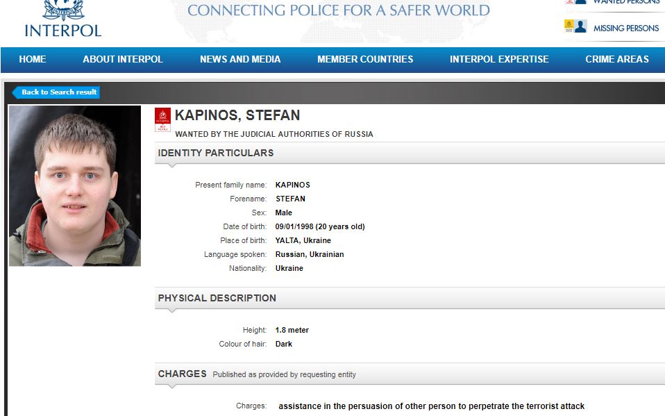 За запитом Росії Інтерпол оголосив у розшук 20-річного громадянина України Стефана Капіноса за підозрою у підготовці разом із незаконно арештованим українцем Павлом Грибом теракту в школі в Сочі.