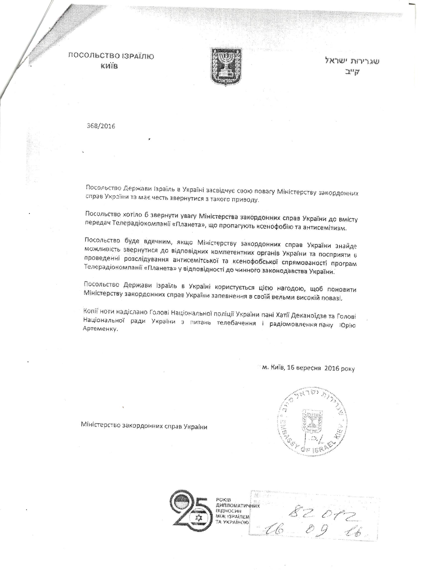 Посольство Ізраїлю в Україні передало Міністерству закордонних справ України ноту, що стосується змісту передач телерадіокомпанії "Планета", в яких ізраїльська сторона вбачає пропаганду антисемітизму і ксенофобії.