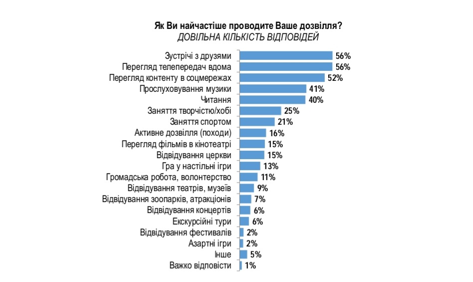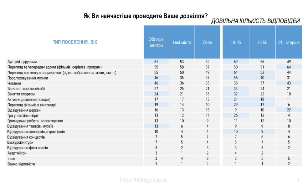 Види дозвілля відрізняються серед представників різних вікових груп. Молодші респонденти (18-35 років) частіше інших переглядають контент у соцмережах, зустрічаються із друзями, слухають музику, переглядають фільми у кінотеатрах, займаються спортом. Найстарші (51 і старше) натомість частіше читають книги, відвідують церкву та переглядають телепередачі.