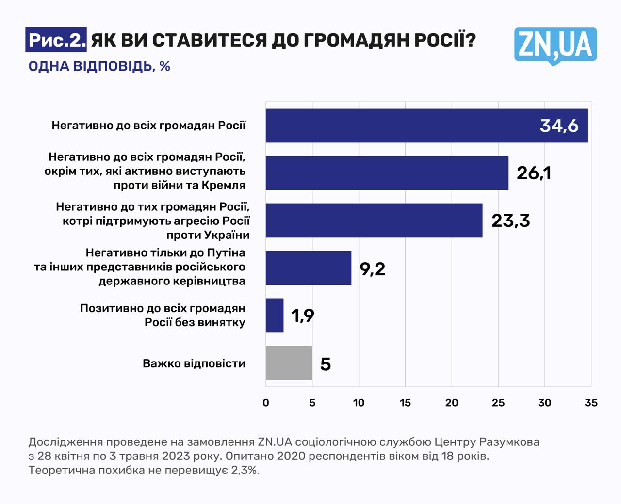 Повномасштабне вторгнення кардинально змінило ставлення українців до Росії. Про це свідчать і відповіді на запитання «Як ви ставитеся до громадян Росії?». Тією чи іншою мірою 84% українців ставляться до громадян Росії негативно (див. рис. 2). Понад третина респондентів (34,6 %) вважає, що росіяни несуть колективну відповідальність за війну з Україною, незалежно від їхніх політичних переконань. Судячи з відповідей, понад чверть українців (26,1%) досі переконані, що десь існують «хороші росіяни», тому негативно ставляться до всіх громадян Росії, окрім тих, які активно виступають проти війни та Кремля. 23,3% не готові змінити своє ставлення до всіх росіян, тому негативно ставляться лише до тих громадян Росії, що підтримують агресію Росії проти України.