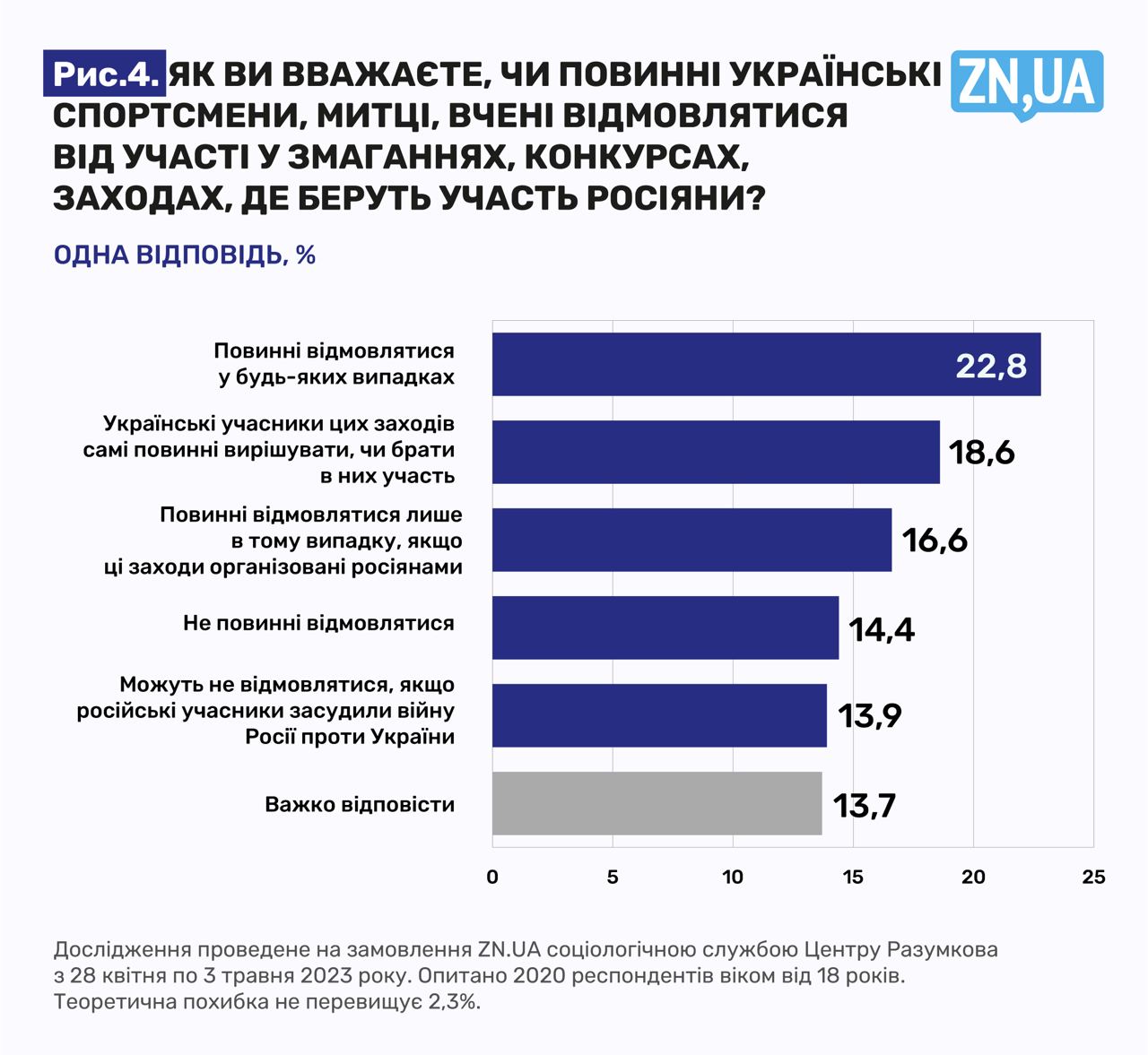 «Як ви вважаєте, чи повинні українські спортсмени, митці, вчені відмовлятися від участі у змаганнях, конкурсах, заходах, де беруть участь росіяни?» — запитали в українців і запропонували обрати одну відповідь. «Повинні відмовлятися» — таку чітку межу між нами і російським агресором обрали 22,8% респондентів, а 16,6% запропонували «...відмовлятися за умови, якщо ці заходи організовані росіянами». Тобто культуру бойкоту цілком підтримують 39,4% українців. Для 13,9% українців достатньою підставою, щоб зберегти контакти і співпрацювати з росіянами, є заява-осуд злочинних дій російської влади. Залишили за українськими учасниками можливість зробити ціннісний вибір та вибрали відповідь «Українські учасники цих заходів самі повинні вирішувати, чи брати в них участь» 18,6% респондентів. Та все ж більше респондентів вважає, що українці мають відмовитися від участі у змаганнях, конкурсах, заходах, в яких беруть участь росіяни (див. рис. 4).