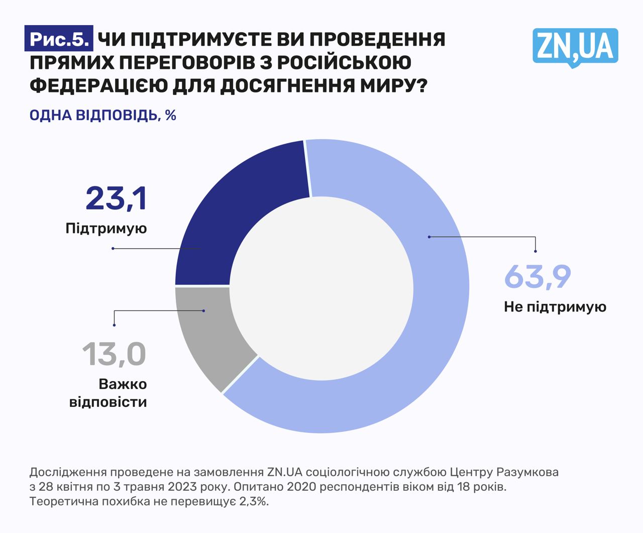 Людяність стала опорою, що допомогла зберегти особистісну та національну ідентичність, створити горизонтальні зв’язки і вірити у перемогу, а не у «перемир’я за будь-яку ціну». Тому на запитання «Чи підтримуєте ви проведення прямих переговорів з Російською Федерацією для досягнення миру?» більшість українців (63,9%) відповіли відмовою. 13% респондентів було «важко відповісти» на це запитання. Лише 23,1% респондентів висловили готовність підтримати проведення прямих переговорів із Росією для досягнення миру (див. рис. 5).