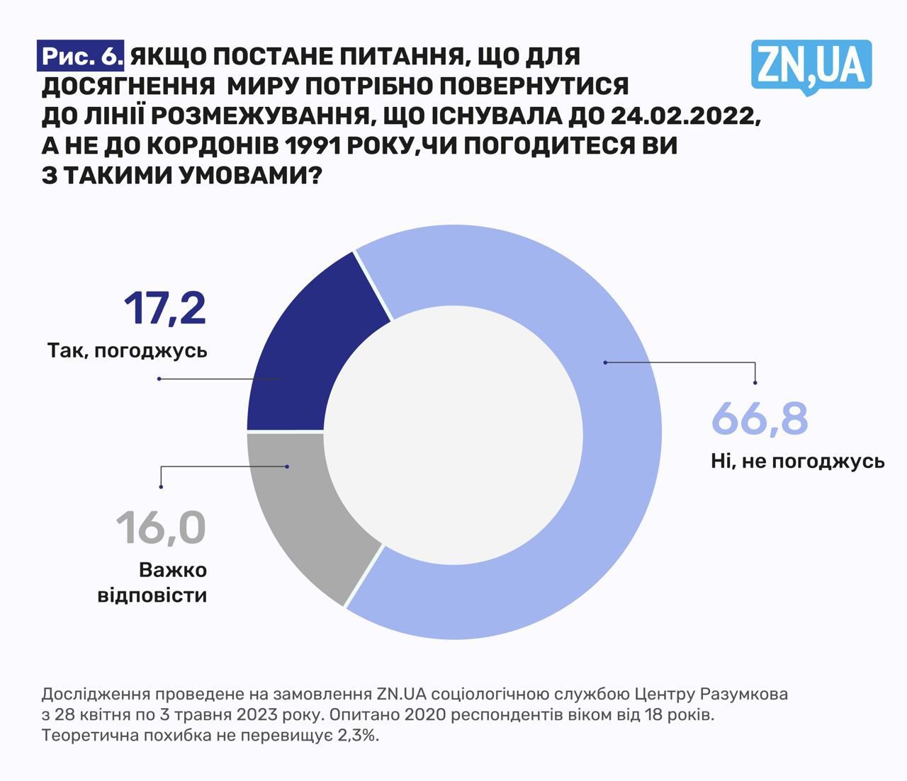 Примітно, що відсоток тих, хто згоден повернутися до лінії розмежування, яка існувала до 24.02.2022 (17,2%), менший за відсоток тих, хто готовий до прямих переговорів із Росією для досягнення миру (23,1%) (див. рис. 6). І владі неодмінно доведеться рахуватися з такими прагненнями українців.