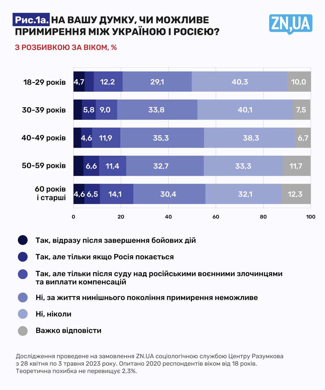 Однак в Україні залишається 21,6% оптимістично налаштованих громадян, які все ж бачать можливість такого примирення. Так, 11,9% опитаних не покладають відповідальності за воєнні злочини російської влади, що скоєні в Україні, на весь російський народ. Тому вважають, що примирення можливе «...після суду над російськими воєнними злочинцями та виплати компенсацій». 5,6% українців вірять у велику силу каяття, тому примирення очікують, «...тільки якщо Росія покається». Відсоток же тих, хто вірить, що можна двічі увійти в одну і ту саму річку, сподівається, що все повернеться, «як було раніше», і обрав варіант відповіді «Відразу після завершення бойових дій», виявився навіть меншим (4,1%) за частку респондентів, які не визначилися і обрали варіант «Важко відповісти» (9,9%).