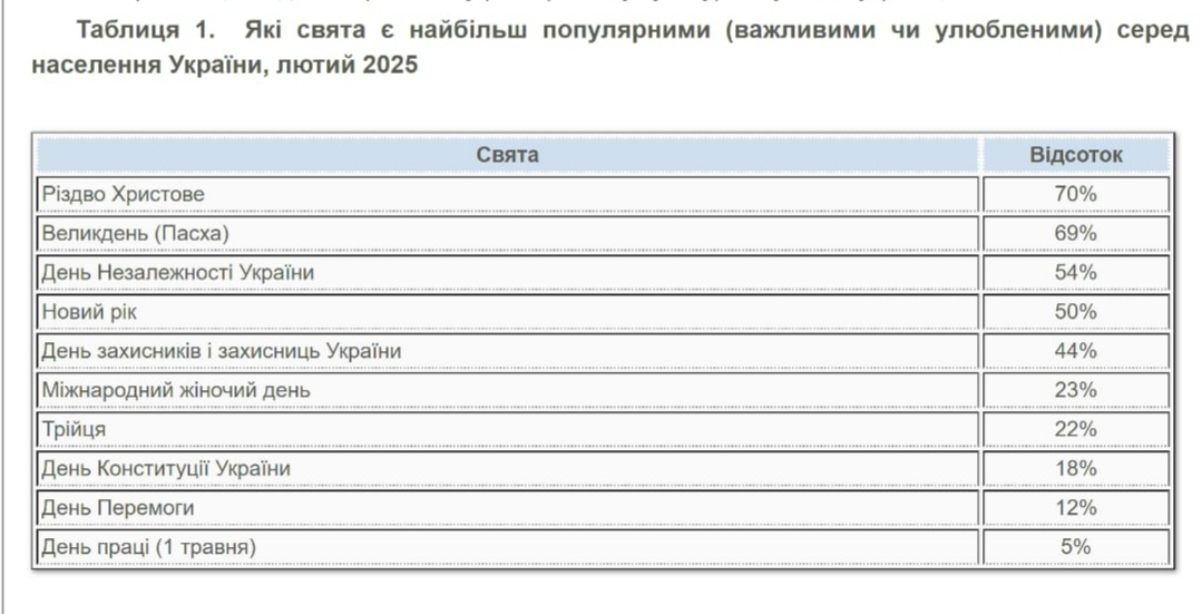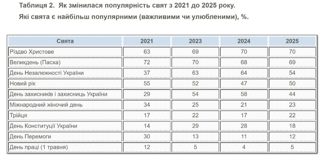 Серед українців зменшилася підтримка свят радянської спадщини. У 2025 році День перемоги є важливим для 12% опитаних (у 2021 році таких було 30%), а День праці (1 травня) — для 5% респондентів (порівняно з 12% у 2021 році).