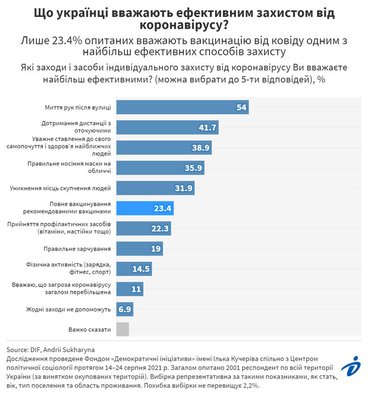 Варто підкреслити, що 22% вважають ефективним вживання засобів профілактики (наприклад вітамінів), що є приблизно співмірним з кількістю людей, які ефективним способом захисту вважають вакцинацію.