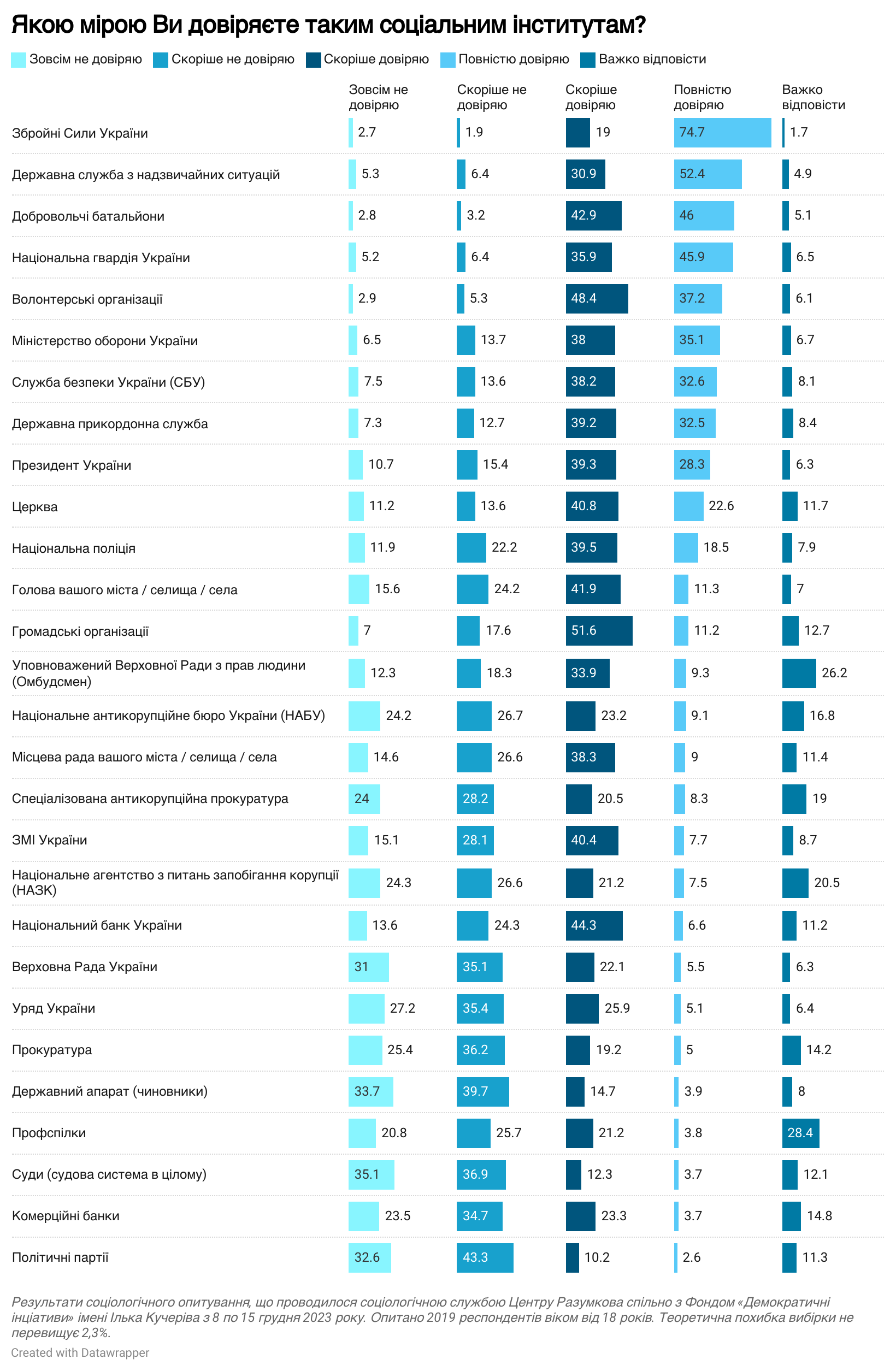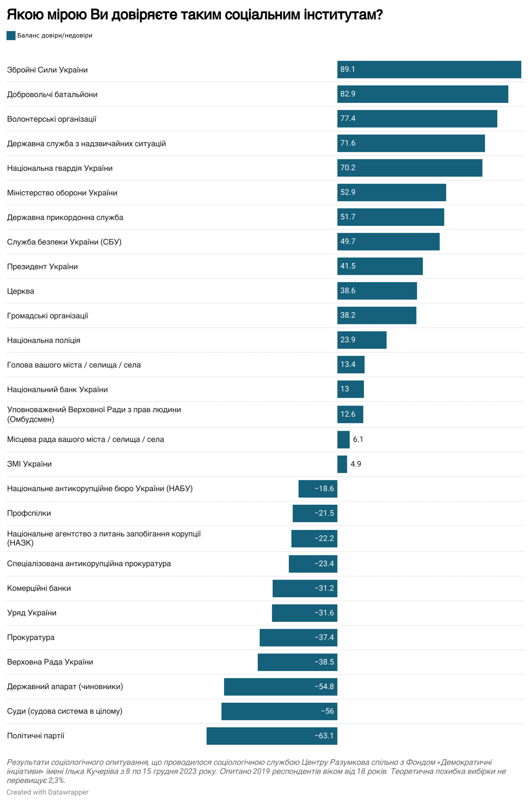 Довіра українців до Збройних Сил України та інших силових структур значно вища, ніж до персоналій в українській політиці та державному управлінні. Якщо у рейтингу посадовців, політиків та громадських діячів за балансом довіри президент Володимир Зеленський займає другу позицію з 47,3%, то у рейтингу соціальних інститутів за балансом довіри президент знаходиться на 9-й сходинці з 41,5%, згідно з результатами опитування Фонду «Демократичні ініціативи» імені Ілька Кучеріва спільно з соціологічною службою Центру Разумкова.
