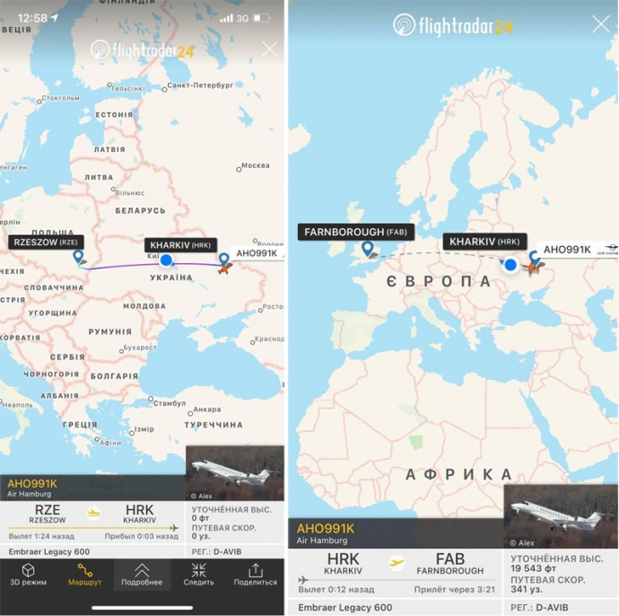 За даними Flightradar, літак прямує до аеропорту Фарнборо (Велика Британія).