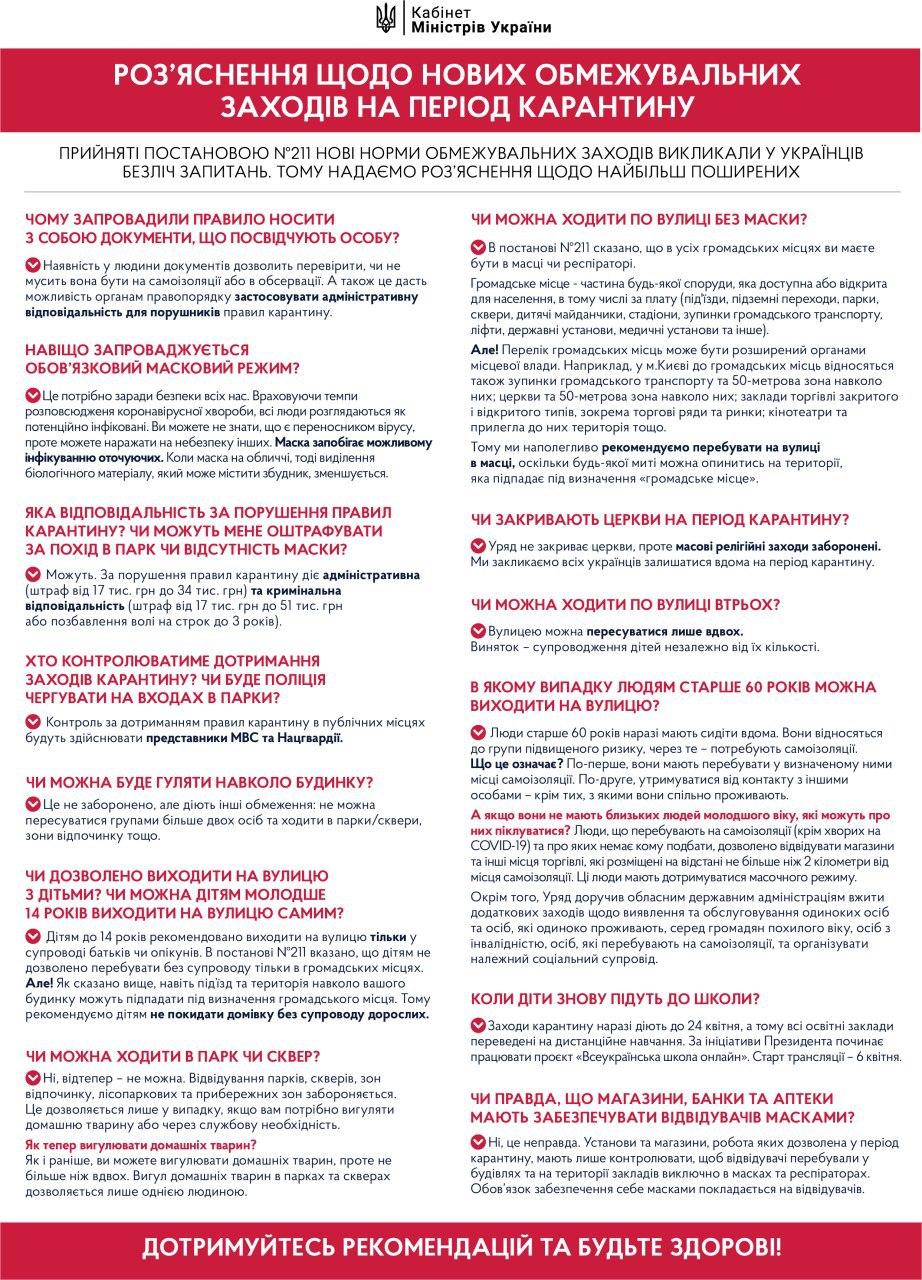 В постанові уряду зазначено, що всі люди повинні носити захисні маски в громадських місцях. При цьому перелік громадських місць може бути розширений органами місцевої влади. Тому у Кабміні рекомендували завжди носити маску. Масковий режим запроваджено для того, щоб запобігти можливому інфікуванню оточуючих. У зв'язку з тим, що COVID-19 може протікати без симптомів, людина може не знати про інфікування, таким чином заражаючи інших.