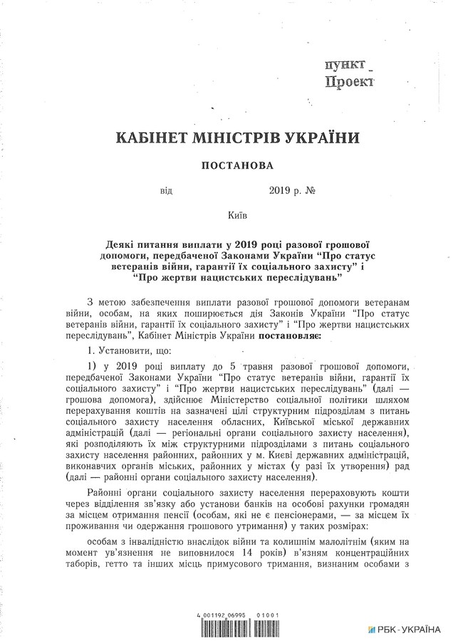 Кабінет міністрів на засіданні у середу затвердив одноразові виплати ветеранам війни в травні 2019 року. Згідно з розпорядженням, Мінсоцполітики доручено здійснити нарахування виплат до 5 травня. Зокрема, особам з інвалідністю внаслідок війни, малолітнім в'язням концтаборів передбачена виплата у розмірі 3850 грн - для I групи інвалідності; 3400 грн - для II групи і 2950 грн для III групи.