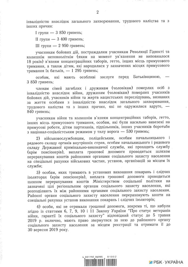 Учасники бойових дій, постраждалі учасники Революції гідності і діти, народжені в місцях позбавлення волі батьків, отримають по 1925 гривень одноразової виплати. За особливі заслуги перед батьківщиною передбачена виплата у розмірі 3850 грн. Члени сімей загиблих на війні, учасників війни і жертв нацистських переслідувань, визнаних за життя особами з інвалідністю, які не одружилися вдруге – 840 грн; учасникам війни та колишнім в'язням концентраційних таборів, остарбайтерам, дітям партизанів та інших учасників боротьби з націонал-соціалістським режимом у тилу – 530 грн.