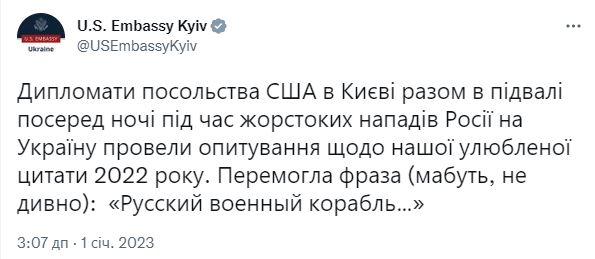 «Дипломати посольства США в Києві разом в підвалі посеред ночі під час жорстоких нападів Росії на Україну провели опитування щодо нашої улюбленої цитати 2022 року. Перемогла фраза (мабуть, не дивно): «Русский военный корабль…», – йдеться у твіті посольства США в Києві.