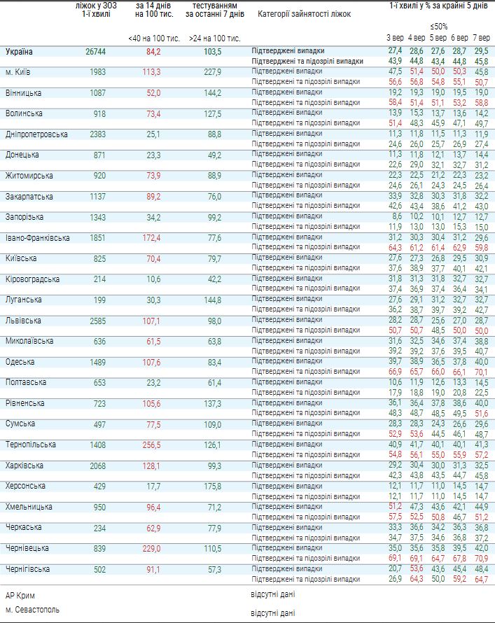- завантаженість ліжок в закладах охорони здоров'я, визначених для госпіталізації пацієнтів з підтвердженим випадком COVID-19, становить понад 50% протягом п'яти днів поспіль;