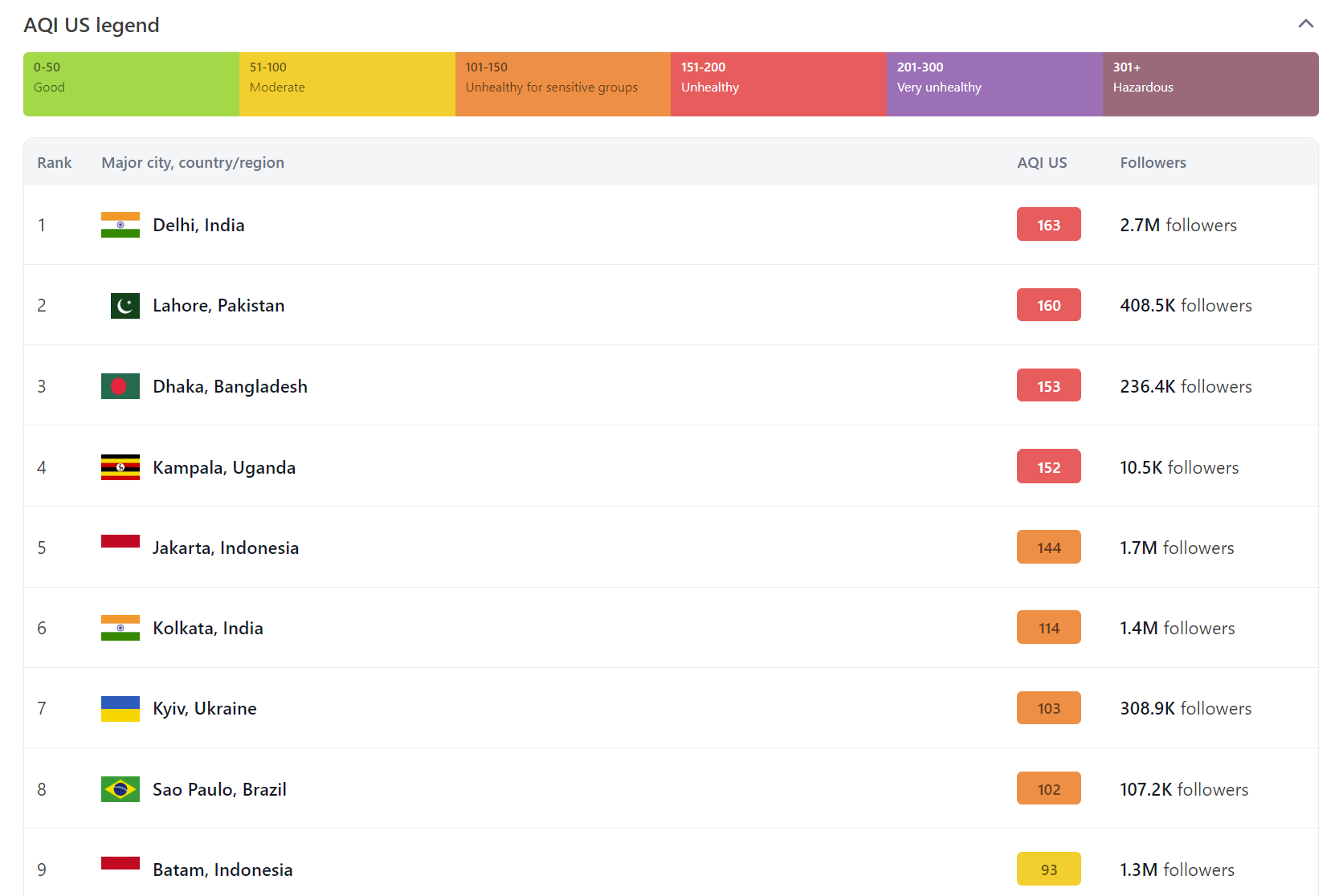 Станом на 9:35 Київ перебував на 7 сходинці у рейтингу міст з найбільшим рівнем забруднення повітря.