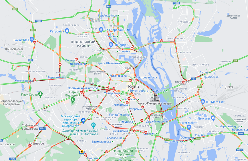 У заторах стоять Дарницький міст, міст Патона, Північний та Південний мости (Лівий берег). А також проспекти Перемоги, Повітрофлотський, Степана Бандери, Голосіївський та Леся Курбаса; вулиці Вадима Гетьмана, Борщагівська, Щусєва, Саксаганська, Кирилівська, Павла Скоропадського та Січових Стрільців.