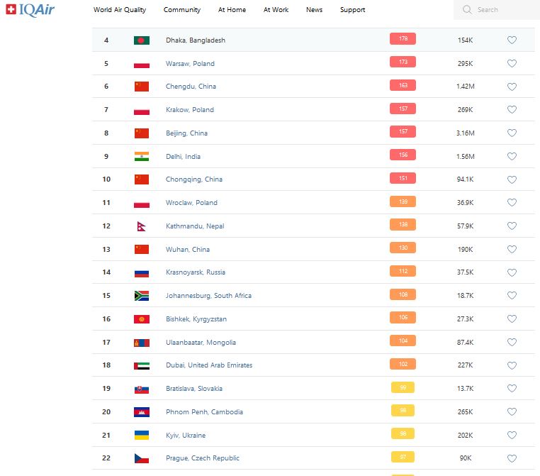 Об 11:00 Київ знаходиться на 19 місці в цьому рейтингу. На перших рядках списку Лахор (Пакистан), Дакка (Бангладеш) і Мумбаї (Індія), але вже до 12:00 за київським часом столиця України була на 21-му місці з індексом 98 при нормі 50.