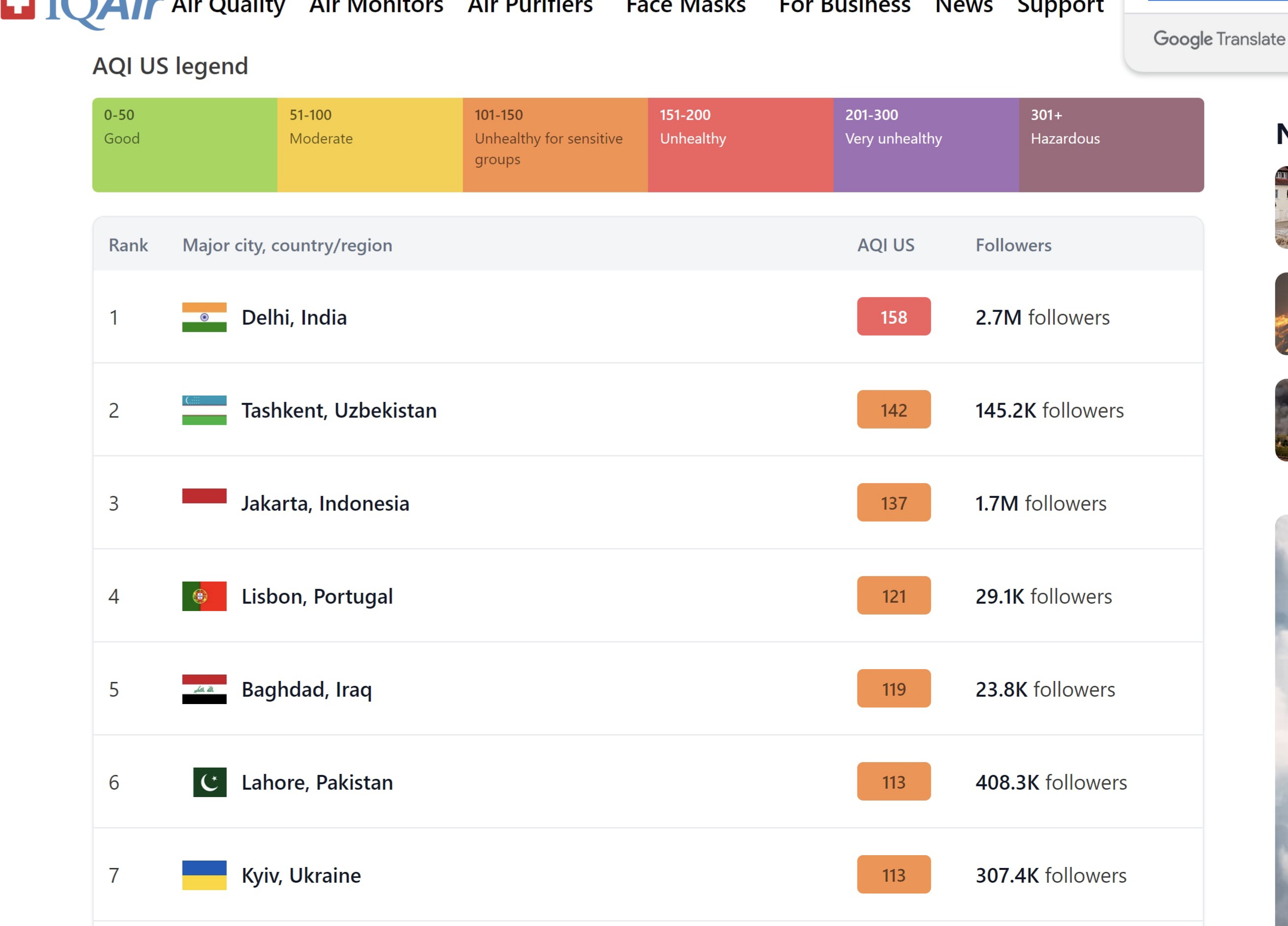 За інформацією швейцарського сервісу IQ Air, українська столиця входить до десятки найзабрудненіших міст світу та станом на 10:30 22 вересня розташовується на сьомому місці з індексом 113 AQI.