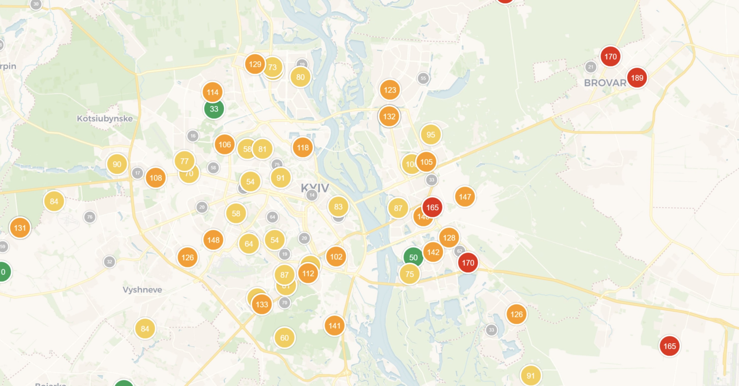 Дані карти забруднення повітря SaveEcoBot, яку розробила громадська організація SaveDnipro, свідчать, що в Києві найгірша якість повітря зафіксована на вулиці Вербицького (170 AQI), Харківському шосе (165 AQI), на вулиці Миколи Шепелєва на Борщагівці (148 AQI) та Алма-Атинській вулиці (147 AQI).