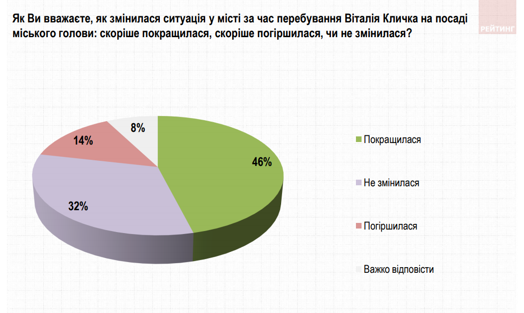 Згідно з результатами дослідження, 46% респондентів вважають, що ситуація в Києві в період, коли пост міського голови займає Кличко, покращилася, 32% стверджують, що вона не змінилася. Ще 14% опитаних побачили погіршення за цей період.