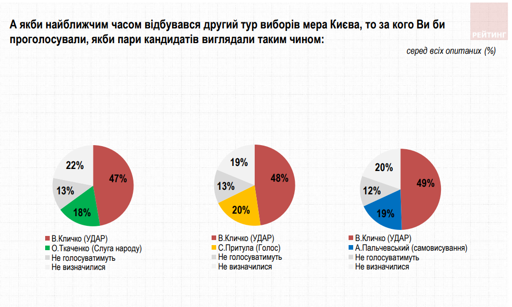 Крім того, в парі з Ткаченком Кличка готові підтримати 47% опитаних. В парі з Притулою - 48%, в парі з Пальчевським - 49%.