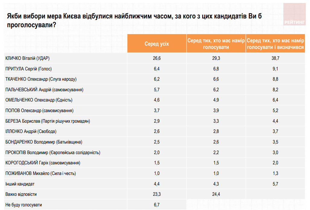 За умови проведення виборів найближчим часом, кандидатуру Віталія Кличка підтримали б 38,7% тих, хто визначився з вибором і має намір взяти участь у голосуванні. Сергія Притулу підтримали б 9,1% таких опитаних, а Олександра Ткаченка - 8,8%. Про це свідчать результати опитування, проведеного Соціологічною групою "Рейтинг" протягом 4-7 квітня серед жителів Києва.