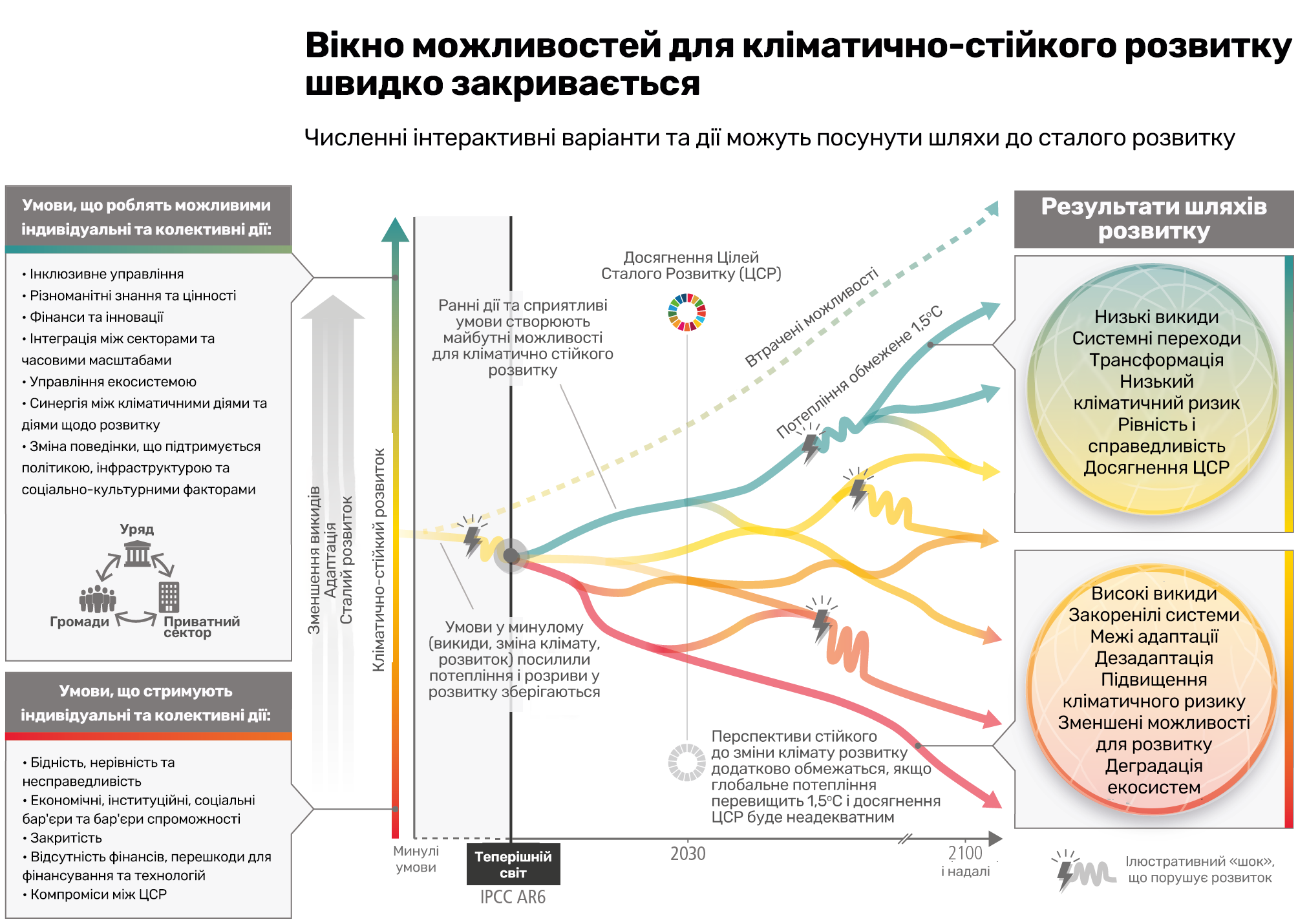 Звісно, ці виклики лише відволікали й далі відволікають ресурси від вирішення й досягнення ЦСР. Якщо повернутися до рис. 1, то такі події там позначені блискавками й названі «шок, який порушує розвиток», і це порушення то більше, що далі від кліматично стійкого шляху, тобто від зеленого до червоного кольору ліній. Шокові події можуть бути різними й мати як природний характер (ураган, землетрус, виверження вулкана, цунамі тощо), так і бути спричиненими безпосередньо людиною (війна, аварія на кшталт Чорнобильської катастрофи, пандемія та ін.). Водночас певні природні шокові події також інтенсифікуються через вплив людини (див. рис. 2 TS.2 з ризиками).