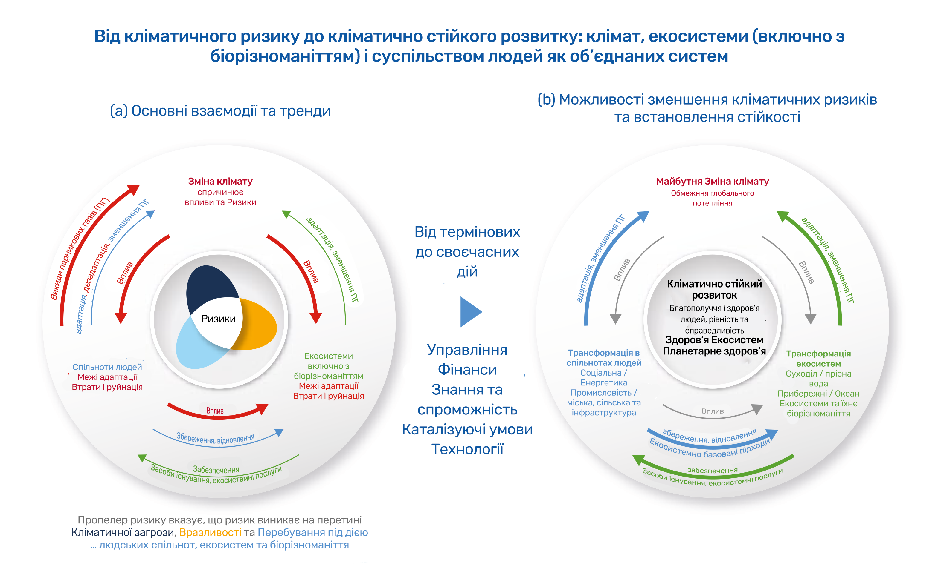 Усі ці запити суспільства відповідають кліматично стійкому розвитку та переходу від реактивного до проактивного реагування на кліматичні ризики, як показано на рис. 2, де запорукою такої трансформації є управління, фінанси, знання та потенціал, технології й умови, за яких процеси трансформації пришвидшуватимуться.