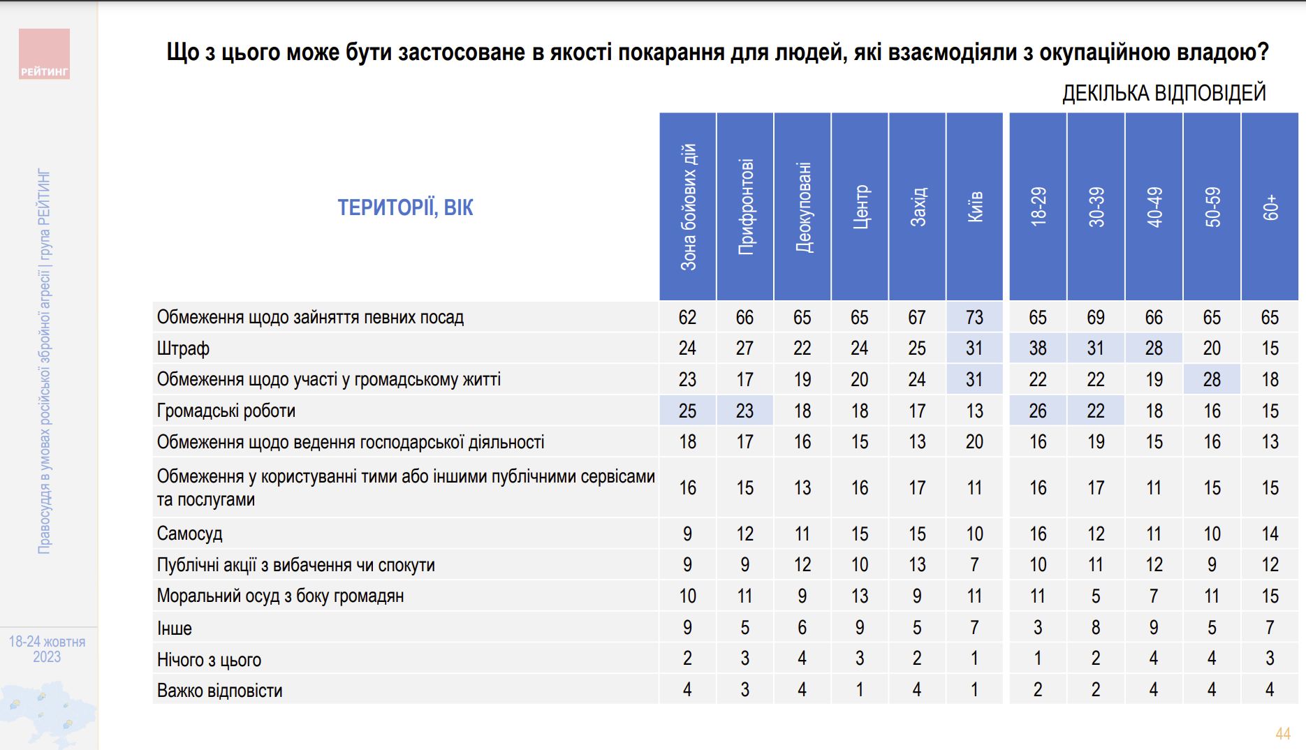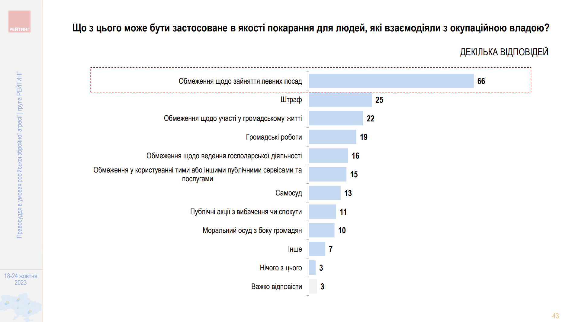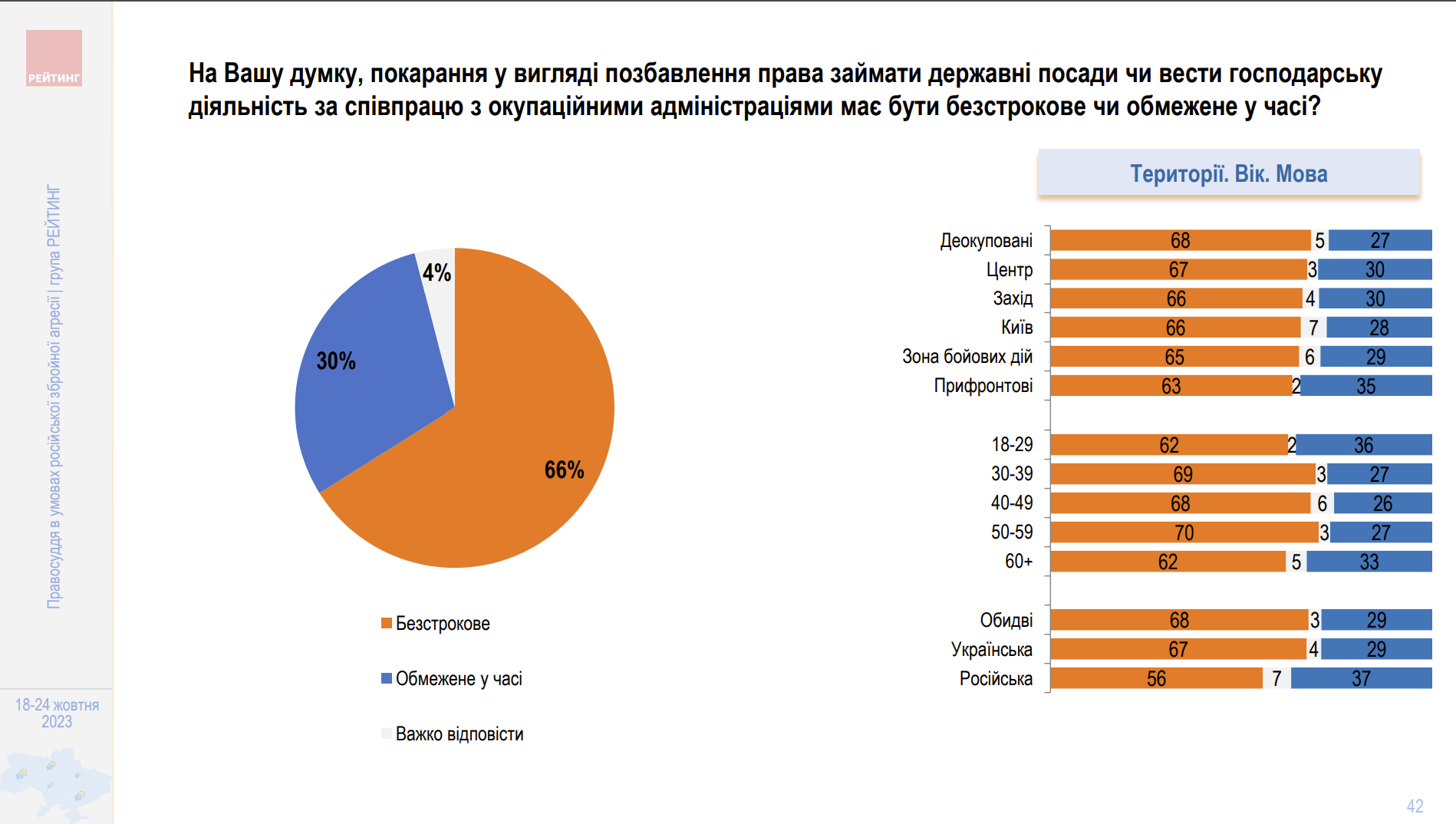 Водночас 66% українців переконані, що покарання за співпрацю з окупаційними адміністраціями, у вигляді позбавлення права займати державні посади, чи вести господарську діяльність має бути безстроковим. На думку ще 30 % респондентів, воно має бути обмеженим у часі.