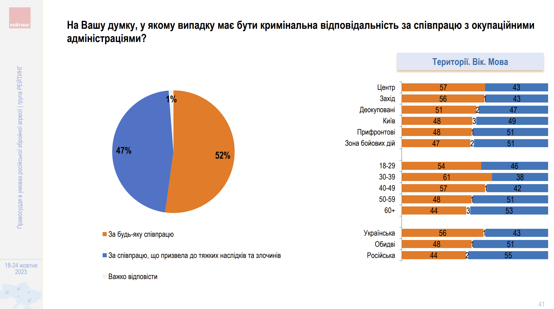 Водночас 52% опитаних переконані, що кримінальна відповідальність має бути за будь-яку співпрацю з окупаційними адміністраціями, а 47% – лише та, що спричинила тяжкі наслідки та злочини.