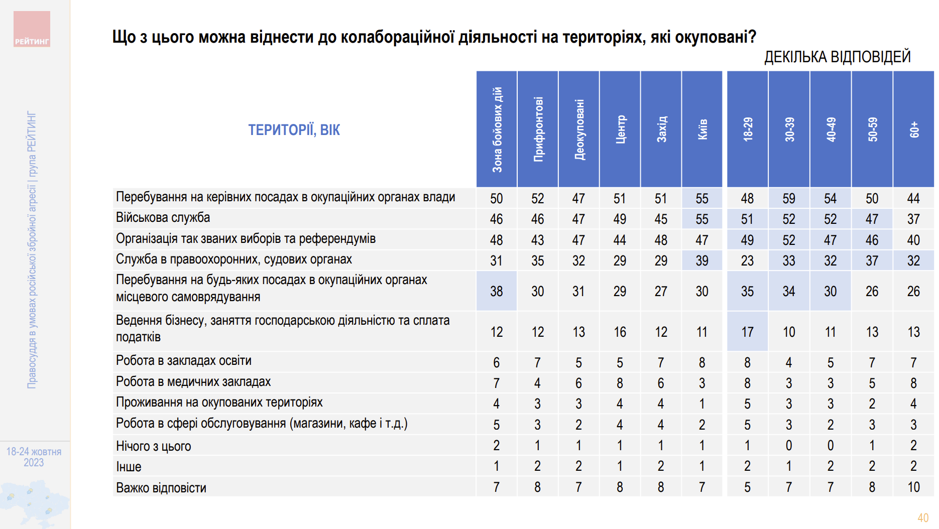 Найчастіше українці вважають колабораційною діяльністю перебування на керівних посадах в органах окупаційної влади. Зокрема, таких громадян 50%, йдеться в результаті опитування, проведеного Соціологічною групою «Рейтинг».