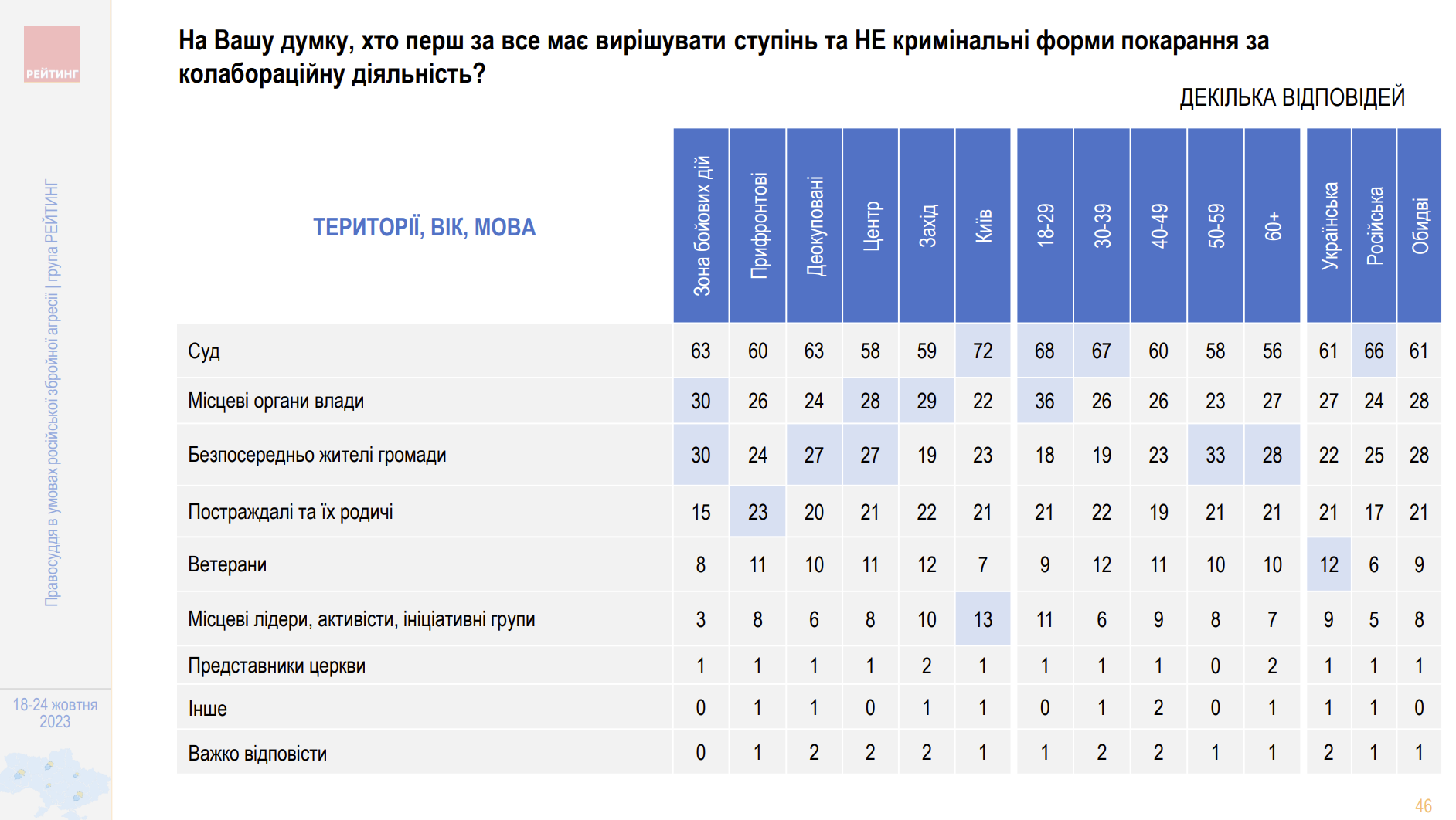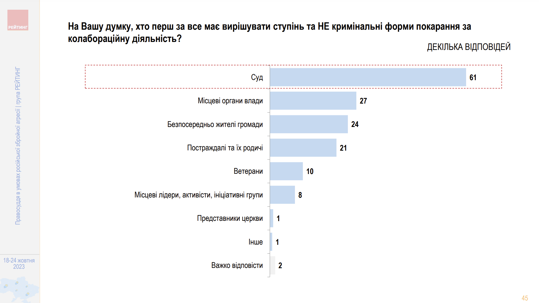 У контексті того, хто має визначати ступінь та некримінальні форми покарання за колабораційну діяльність, 66% опитаних говорили про суд. Ще 27% вважають, що такі рішення мають приймати місцеві органи влади, а 24% – жителі громади безпосередньо. На думку 21% таке рішення мають ухвалювати постраждалі та їхні родичі.