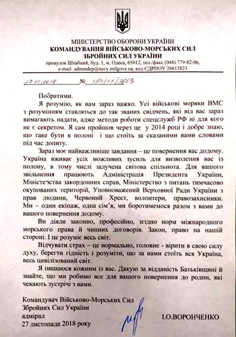 Командувач Військово-морськими силами України Ігор Воронченко у вівторок, 27 листопада, звернувся до українських військових, незаконно захоплених російськими спецпризначенцями у районі Керченської протоки. Звернення на своїй сторінці в Facebook оприлюднив речник Генеральної прокуратури України Андрій Лисенко.