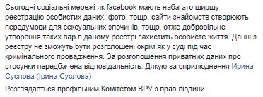 У комітет Верховної Ради з питань прав людини надійшла письмова пропозиція створити державний реєстр (добровільний) осіб, які почали статеве життя, або, якщо скорочено, "реєстр сексу", повідомила голова комітету Ірина Суслова.