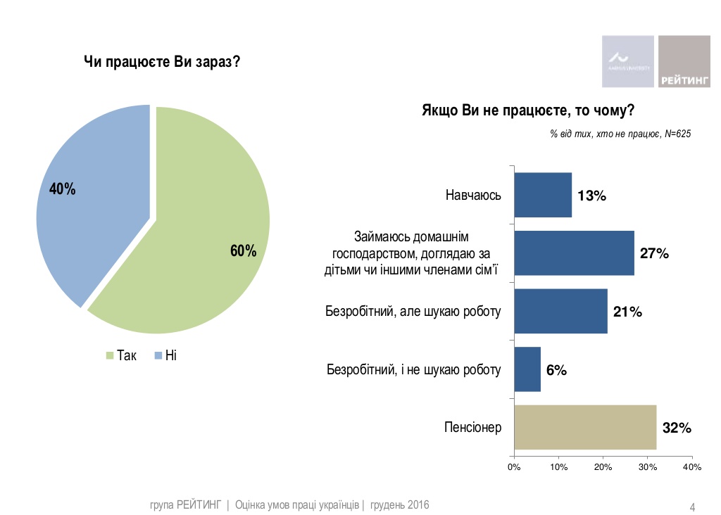 Опитування Соціологічної групи "Рейтинг" було проведено 1-10 грудня 2016 року серед 1580 працездатних українців (чоловіки - віком 18-65 років, жінки - 18-60 років) методом особистого формалізованого інтерв'ю (face-to-face). Помилка репрезентативності дослідження: не більше 2,5%.